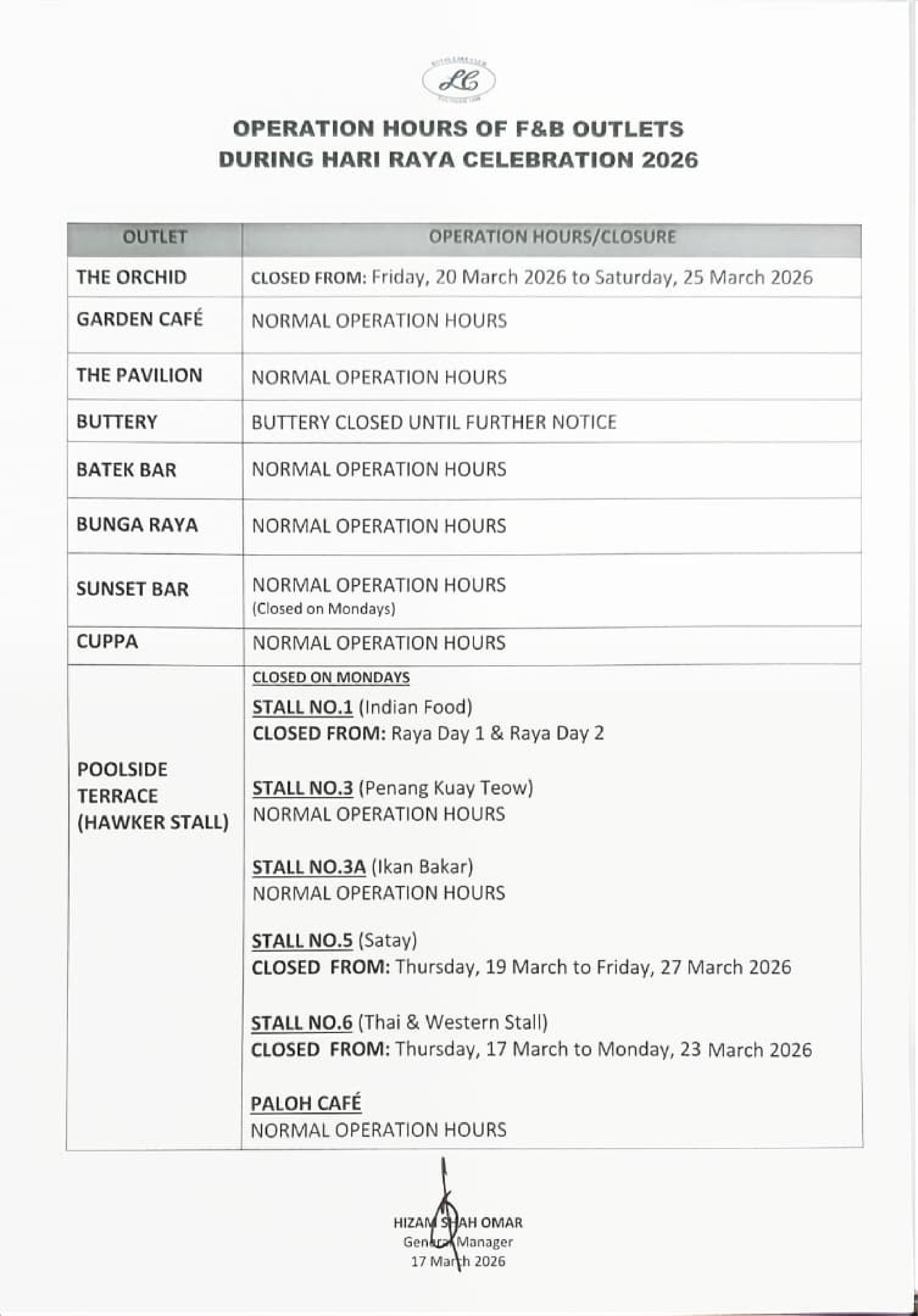 F&B Outlets Operation Hours During Hari Raya